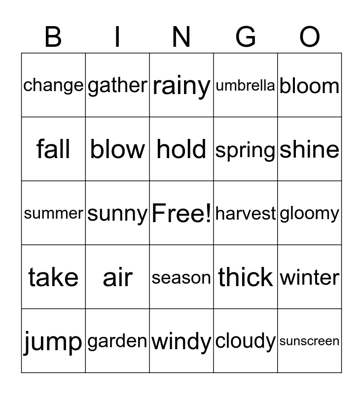 This bingo card has a free space and 24 words: air, garden, hold, jump, bloom, change, fall, gather, harvest, season, spring, summer, thick, winter, blow, cloudy, gloomy, rainy, shine, sunny, sunscreen, take, umbrella and windy.