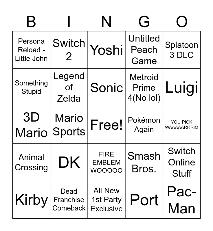 This bingo card has a free space and 24 words: DK, Dead Franchise Comeback, Sonic, Kirby, Splatoon 3 DLC, Persona Reload - Little John, Something Stupid, Switch 2, Pokémon Again, FIRE EMBLEM WOOOOO, Metroid Prime 4(No lol), 3D Mario, Smash Bros., Switch Online Stuff, Legend of Zelda, Port, YOU PICK WAAAAARRRIO, Yoshi, Luigi, Mario Sports, Pac-Man, Animal Crossing, Untitled Peach Game and All New 1st Party Exclusive.