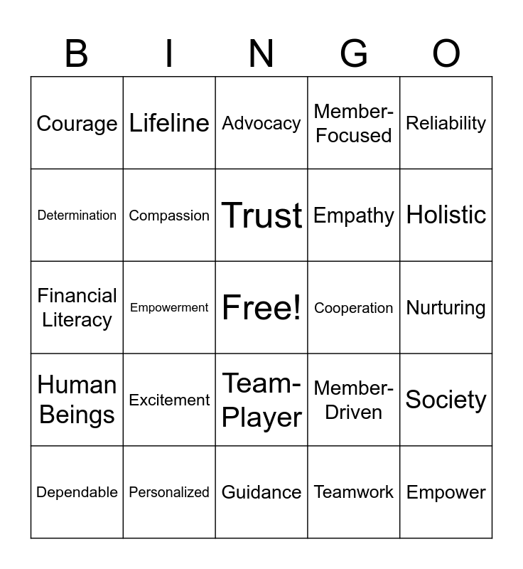 This bingo card has a free space and 83 words: Accessibility, Adaptable, Advocacy, Assistance, Augment, Challenge, Champion, Change, Citizens, Collaboration, Commitment, Community, Compassion, Cooperation, Cooperative, Courage, Dependable, Determination, Devotion, Education, Elevate, Empathy, Empower, Empowering, Empowerment, Enable, Enhance, Enhancing Lives, Enrich, Enthusiasm, Excitement, Expertise, Fervor, Financial Literacy, Financial Security, GRIT, Guidance, Heritage, Holistic, Human Beings, Improve, Inclusivity, Individuals, Integrity, It’s About WE, Legacy, Lifeline, Lifelong Learning, Local, Local impact, Member-Driven, Member-Focused, Nurturing, Partnership, Passion, People, People Helping People, Perseverance, Personalized, Progress, Prosperity, Purpose, Relationship, Reliability, Resilience, Society, SouthPoint, Stability, Stewardship, Strengthen, Support, Synergy, Team, Team-Player, Teamwork, Tenacity, Together, Trust, Unity, Upgrade, Uplift, Willpower and Zeal.
