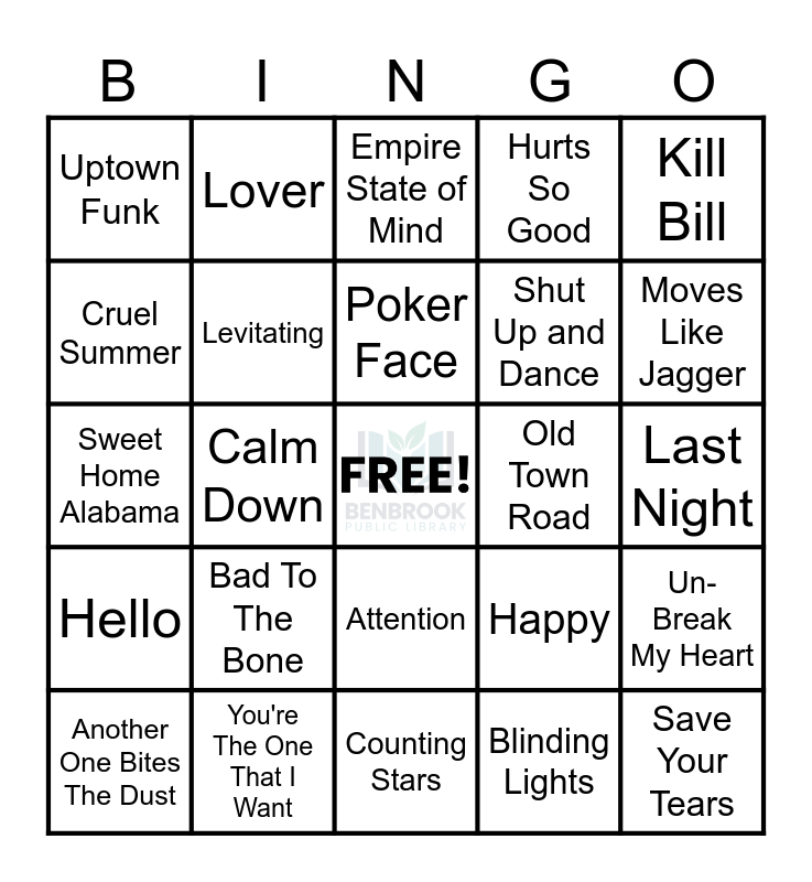 This bingo card has a free space and 65 words: Fast Car, Driver's Licence, Flowers, Un-Break My Heart, Behind These Hazel Eyes, Chandelier, Lover, Love On The Brain, Poker Face, Dance The Night, Attention, As It Was, Last Night, Kill Bill, Boy's A Liar, Cruel Summer, Calm Down, Uptown Funk, Shape of You, Shut Up and Dance, Bad To The Bone, Hello, Hurts So Good, Thunder, Roar, Rude, Brown Eyed Girl, Blurred Lines, Save Your Tears, Somebody That I Used to Know, Another One Bites The Dust, Moves Like Jagger, Ain't No Mountain High Enough, Thunderstruck, Happy, You're The One That I Want, Low, Sweet Home Alabama, Blinding Lights, Circles, Levitating, We Found Love, Old Town Road, Mood, No One, Royals, Moves Like Jagger, Just the Way You Are, See You Again, One More Night, All of Me, Shake it Off, Bad Guy, Counting Stars, Locked out of Heaven, Love the Way You Lie, Hey, Soul Sister, Empire State of Mind, Havana, Timber, Stay, Man! I Feel Like a Woman!, Need You Now, My Church and Achy Breaky Heart.