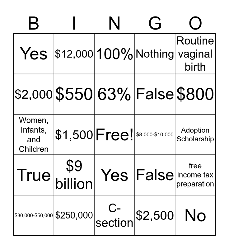 This bingo card has a free space and 24 words: $9 billion, $250,000, 63%, $30,000-$50,000, Routine vaginal birth, Yes, $2,000, $12,000, $8,000-$10,000, Yes, False, Women, Infants, and Children, False, free income tax preparation, $550, $2,500, Adoption Scholarship, 100%, $800, $1,500, No, True, Nothing and C-section.