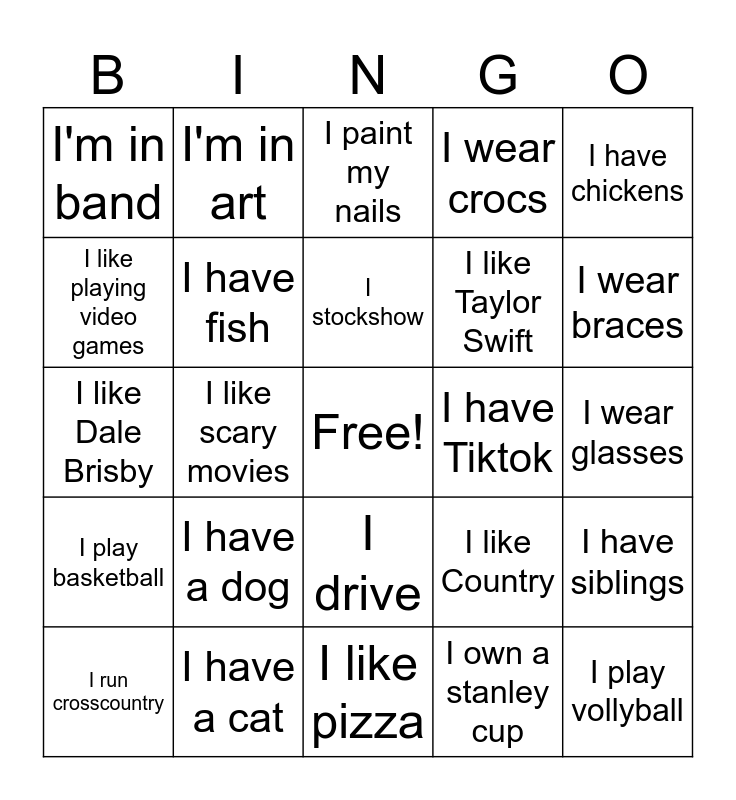 This bingo card has a free space and 24 words: I have a dog, I have a cat, I stockshow, I run crosscountry, I have chickens, I'm in band, I like playing video games, I'm in art, I have Tiktok, I drive, I like Taylor Swift, I like Dale Brisby, I like Country, I have siblings, I have fish, I own a stanley cup, I wear glasses, I paint my nails, I wear braces, I like scary movies, I play vollyball, I play basketball, I wear crocs and I like pizza.