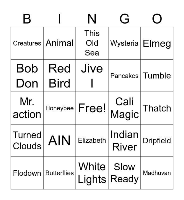 This bingo card has a free space and 24 words: AIN, Butterflies, Jive I, Flodown, Elmeg, Creatures, Bob Don, Animal, Cali Magic, Elizabeth, Pancakes, Mr. action, Indian River, Dripfield, Red Bird, Slow Ready, Thatch, This Old Sea, Tumble, Honeybee, Madhuvan, Turned Clouds, Wysteria and White Lights.