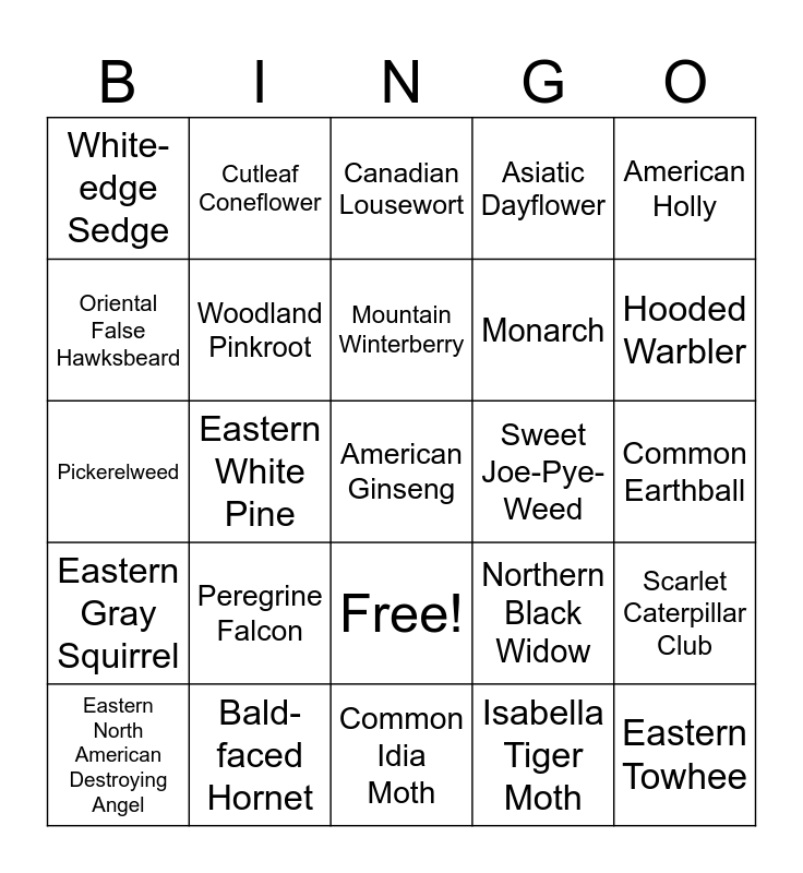 This bingo card has 26 words: Free!, Isabella Tiger Moth, Mountain Winterberry, Bald-faced Hornet, American Holly, White-edge Sedge, Oriental False Hawksbeard, Cutleaf Coneflower, Common Earthball, Northern Black Widow, Monarch, Pickerelweed, Scarlet Caterpillar Club, Eastern North American Destroying Angel, Eastern White Pine, Rambur's Forktail, Asiatic Dayflower, Eastern Gray Squirrel, Canadian Lousewort, American Ginseng, Hooded Warbler, Common Idia Moth, Sweet Joe-Pye-Weed, Peregrine Falcon, Woodland Pinkroot and Eastern Towhee.
