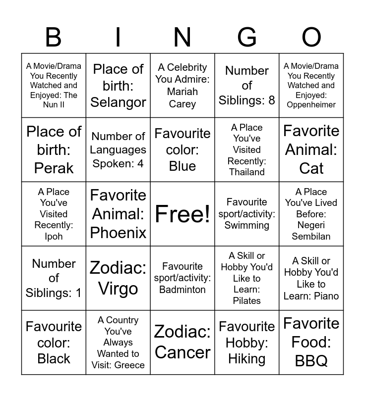 This bingo card has a free space and 25 words: Zodiac: Virgo, Zodiac: Cancer, Favourite color: Blue, Favourite color: Black, A Movie/Drama You Recently Watched and Enjoyed: Oppenheimer, A Movie/Drama You Recently Watched and Enjoyed: The Nun II, Place of birth: Perak, Place of birth: Selangor, Favourite sport/activity: Swimming, Favourite sport/activity: Badminton, A Place You've Visited Recently: Thailand, A Place You've Visited Recently: Ipoh, A Skill or Hobby You'd Like to Learn: Pilates, A Skill or Hobby You'd Like to Learn: Piano, Number of Languages Spoken: 4, A Place You've Lived Before: Kuala Lumpur, A Place You've Lived Before: Negeri Sembilan, A Celebrity You Admire: Mariah Carey, Favorite Animal: Cat, Favorite Animal: Phoenix, Favorite Food: BBQ, A Country You've Always Wanted to Visit: Greece, Number of Siblings: 1, Number of Siblings: 8 and Favourite Hobby: Hiking.