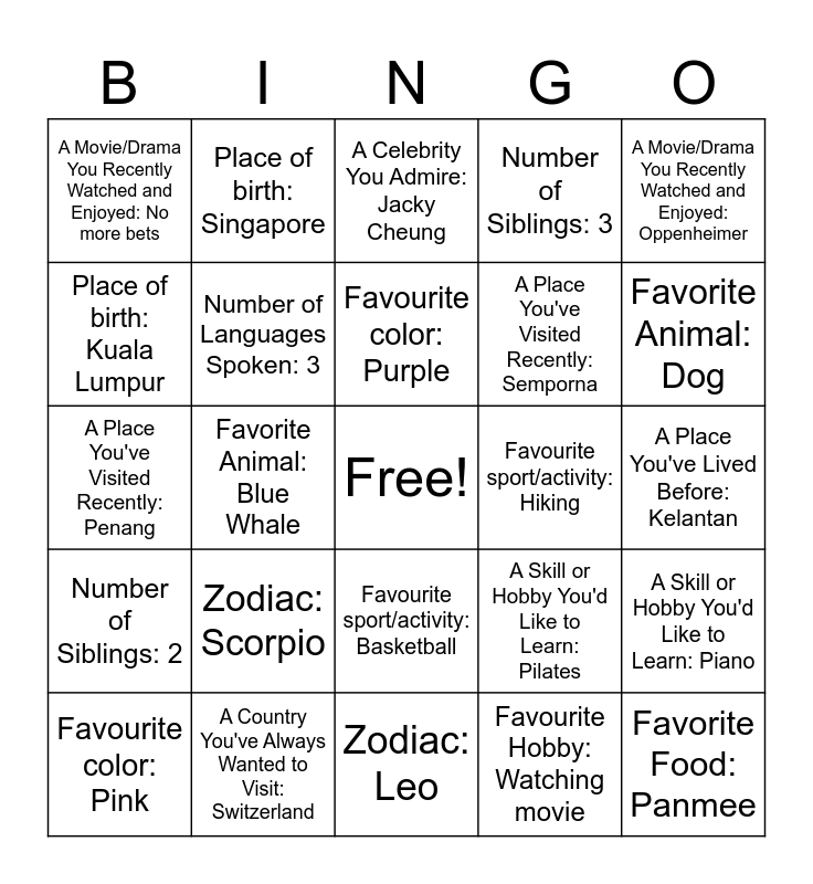 This bingo card has a free space and 25 words: Zodiac: Scorpio, Zodiac: Leo, Favourite color: Purple, Favourite color: Pink, A Movie/Drama You Recently Watched and Enjoyed: Oppenheimer, A Movie/Drama You Recently Watched and Enjoyed: No more bets, Place of birth: Kuala Lumpur, Place of birth: Singapore, Favourite sport/activity: Hiking, Favourite sport/activity: Basketball, A Place You've Visited Recently: Semporna, A Place You've Visited Recently: Penang, A Skill or Hobby You'd Like to Learn: Pilates, A Skill or Hobby You'd Like to Learn: Piano, Number of Languages Spoken: 3, A Place You've Lived Before: Selangor, A Place You've Lived Before: Kelantan, A Celebrity You Admire: Jacky Cheung, Favorite Animal: Dog, Favorite Animal: Blue Whale, Favorite Food: Panmee, A Country You've Always Wanted to Visit: Switzerland, Number of Siblings: 2, Number of Siblings: 3 and Favourite Hobby: Watching movie.