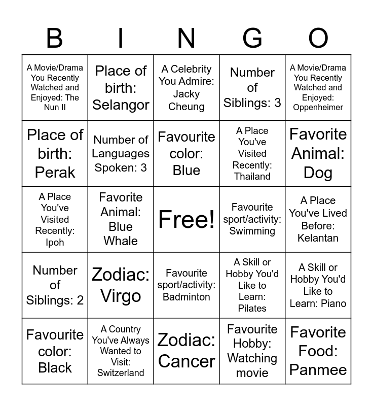 This bingo card has a free space and 25 words: Zodiac: Virgo, Zodiac: Cancer, Favourite color: Blue, Favourite color: Black, A Movie/Drama You Recently Watched and Enjoyed: Oppenheimer, A Movie/Drama You Recently Watched and Enjoyed: The Nun II, Place of birth: Perak, Place of birth: Selangor, Favourite sport/activity: Swimming, Favourite sport/activity: Badminton, A Place You've Visited Recently: Thailand, A Place You've Visited Recently: Ipoh, A Skill or Hobby You'd Like to Learn: Pilates, A Skill or Hobby You'd Like to Learn: Piano, Number of Languages Spoken: 3, A Place You've Lived Before: Selangor, A Place You've Lived Before: Kelantan, A Celebrity You Admire: Jacky Cheung, Favorite Animal: Dog, Favorite Animal: Blue Whale, Favorite Food: Panmee, A Country You've Always Wanted to Visit: Switzerland, Number of Siblings: 2, Number of Siblings: 3 and Favourite Hobby: Watching movie.