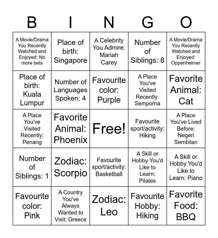 This bingo card has a free space and 25 words: Zodiac: Scorpio, Zodiac: Leo, Favourite color: Purple, Favourite color: Pink, A Movie/Drama You Recently Watched and Enjoyed: Oppenheimer, A Movie/Drama You Recently Watched and Enjoyed: No more bets, Place of birth: Kuala Lumpur, Place of birth: Singapore, Favourite sport/activity: Hiking, Favourite sport/activity: Basketball, A Place You've Visited Recently: Semporna, A Place You've Visited Recently: Penang, A Skill or Hobby You'd Like to Learn: Pilates, A Skill or Hobby You'd Like to Learn: Piano, Number of Languages Spoken: 4, A Place You've Lived Before: Kuala Lumpur, A Place You've Lived Before: Negeri Sembilan, A Celebrity You Admire: Mariah Carey, Favorite Animal: Cat, Favorite Animal: Phoenix, Favorite Food: BBQ, A Country You've Always Wanted to Visit: Greece, Number of Siblings: 1, Number of Siblings: 8 and Favourite Hobby: Hiking.