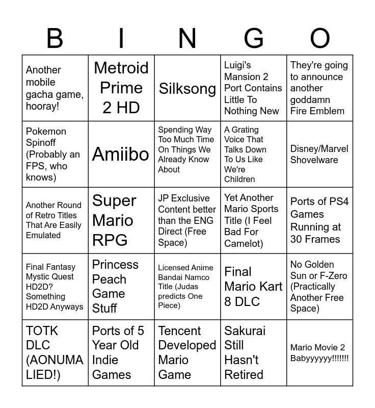 This bingo card has a free space and 24 words: Princess Peach Game Stuff, Ports of 5 Year Old Indie Games, Spending Way Too Much Time On Things We Already Know About, TOTK DLC (AONUMA LIED!), They're going to announce another goddamn Fire Emblem, Another mobile gacha game, hooray!, Pokemon Spinoff (Probably an FPS, who knows), Metroid Prime 2 HD, Yet Another Mario Sports Title (I Feel Bad For Camelot), Licensed Anime Bandai Namco Title (Judas predicts One Piece), A Grating Voice That Talks Down To Us Like We're Children, Another Round of Retro Titles That Are Easily Emulated, Final Mario Kart 8 DLC, No Golden Sun or F-Zero (Practically Another Free Space), Amiibo, Sakurai Still Hasn't Retired, Ports of PS4 Games Running at 30 Frames, Silksong, Disney/Marvel Shovelware, Super Mario RPG, Mario Movie 2 Babyyyyyy!!!!!!!, Final Fantasy Mystic Quest HD2D? Something HD2D Anyways, Luigi's Mansion 2 Port Contains Little To Nothing New and Tencent Developed Mario Game.