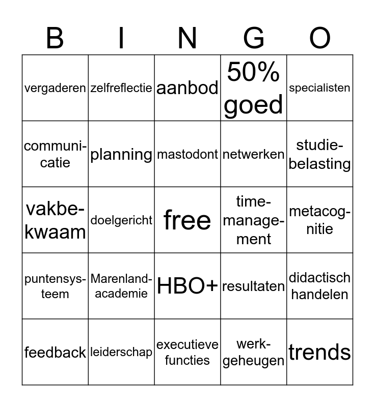 This bingo card has a free space and 24 words: Marenland-academie, leiderschap, mastodont, feedback, specialisten, vergaderen, communi-catie, zelfreflectie, time-manage-ment, HBO+, netwerken, vakbe-kwaam, resultaten, didactisch handelen, planning, werk-geheugen, metacog-nitie, aanbod, studie-belasting, doelgericht, trends, puntensys-teem, 50% goed and executieve functies.