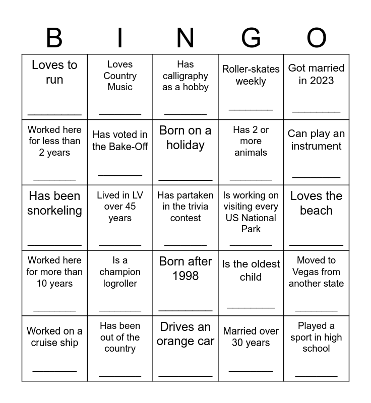 This bingo card has a free space and 24 words: Is a champion logroller ________, Has been out of the country ________, Born on a holiday ________, Worked on a cruise ship ________, Got married in 2023 ________, Loves to run ________, Worked here for less than 2 years ________, Loves Country Music ________, Is working on visiting every US National Park ________, Born after 1998 ________, Has 2 or more animals ________, Has been snorkeling ________, Is the oldest child ________, Moved to Vegas from another state ________, Has voted in the Bake-Off ________, Married over 30 years ________, Loves the beach ________, Has calligraphy as a hobby ________, Can play an instrument ________, Lived in LV over 45 years ________, Played a sport in high school ________, Worked here for more than 10 years ________, Roller-skates weekly ________ and Drives an orange car ________.