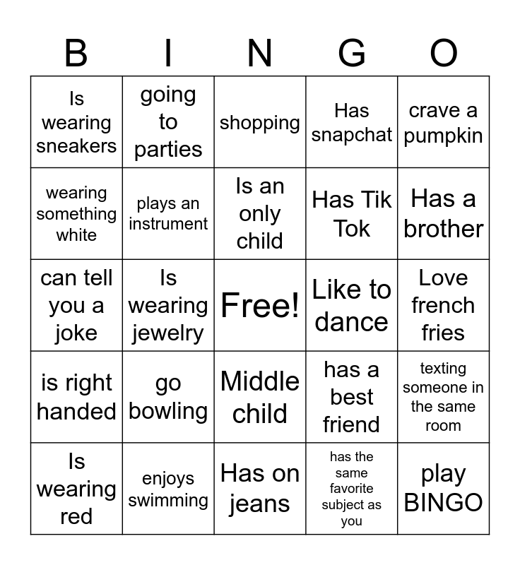 This bingo card has a free space and 39 words: Has a pet, Is wearing blue, gone fishing, plays an instrument, Is wearing red, Middle child, Is an only child, Wear glasses, crave a pumpkin, is right handed, Is wearing jewelry, Has snapchat, play BINGO, Love french fries, Like to dance, go bowling, Play a sport, Is wearing sneakers, likes chocolate ice cream, has a best friend, wearing something white, Has on jeans, Has Tik Tok, Has a brother, take a lot of selfies, has Facebook, enjoys video games, Likes to sing, is afraid of spiders, going to parties, ride a bike, is wearing something white, shopping, enjoys swimming, has the same favorite subject as you, Is the oldest child, texting someone in the same room, can tell you a joke and use social media.