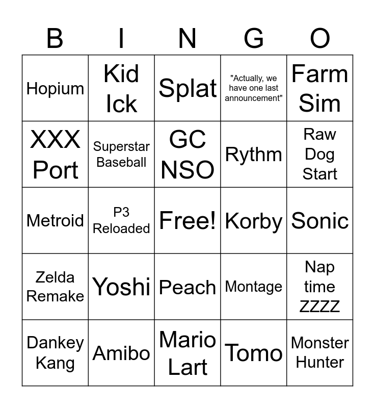 This bingo card has a free space and 24 words: Dankey Kang, Yoshi, GC NSO, Tomo, Farm Sim, Hopium, Kid Ick, Splat, Korby, Sonic, Metroid, Superstar Baseball, Montage, Nap time ZZZZ, XXX Port, Amibo, Mario Lart, "Actually, we have one last announcement", Raw Dog Start, Zelda Remake, P3 Reloaded, Peach, Rythm and Monster Hunter.