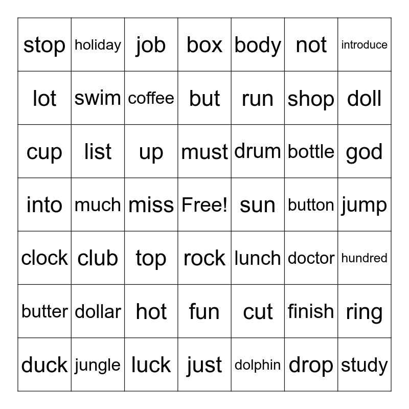 This bingo card has a free space and 60 words: finger, into, kid, list, miss, finish, introduce, if, swim, ring, box, hot, not, top, drop, stop, shop, body, mom, lot, doll, job, god, bottle, sock, rock, clock, copy, coffee, doctor, hospital, dollar, dolphin, follow, holiday, sun, fun, run, lunch, but, cut, up, cup, bus, drum, jump, duck, luck, just, must, much, brush, butter, button, club, hundred, jungle, number, study and supper.