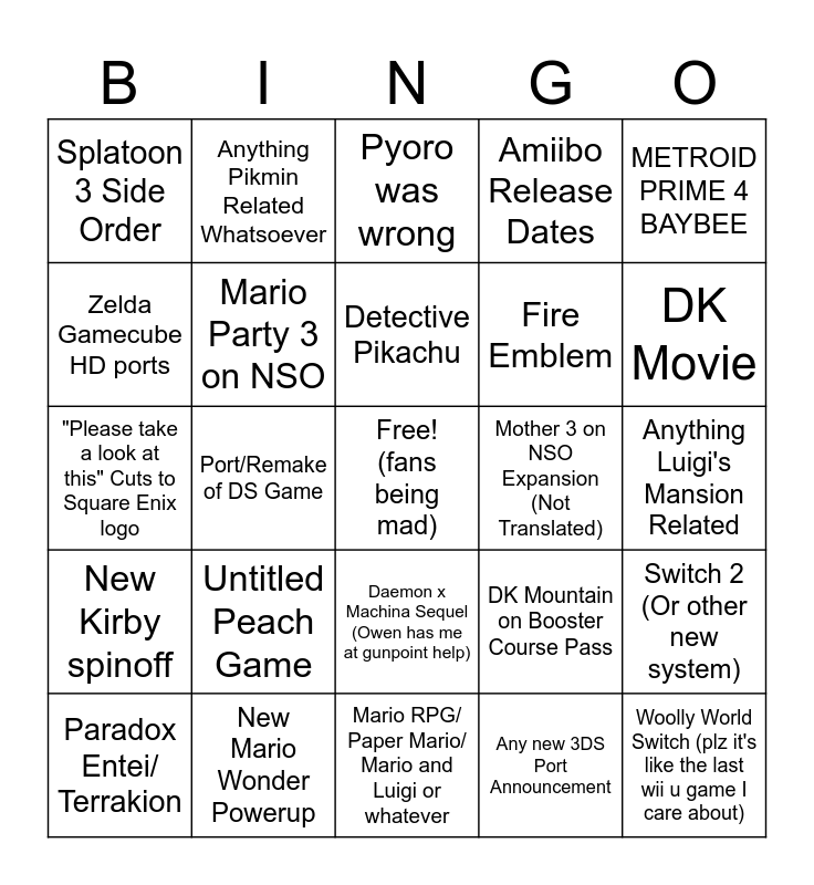 This bingo card has a free space and 24 words: Untitled Peach Game, New Mario Wonder Powerup, Detective Pikachu, Paradox Entei/ Terrakion, METROID PRIME 4 BAYBEE, Splatoon 3 Side Order, Zelda Gamecube HD ports, Anything Pikmin Related Whatsoever, Mother 3 on NSO Expansion (Not Translated), Daemon x Machina Sequel (Owen has me at gunpoint help), Fire Emblem, "Please take a look at this" Cuts to Square Enix logo, DK Mountain on Booster Course Pass, Switch 2 (Or other new system), Mario Party 3 on NSO, Any new 3DS Port Announcement, Anything Luigi's Mansion Related, Pyoro was wrong, DK Movie, Port/Remake of DS Game, Woolly World Switch (plz it's like the last wii u game I care about), New Kirby spinoff, Amiibo Release Dates and Mario RPG/ Paper Mario/ Mario and Luigi or whatever.