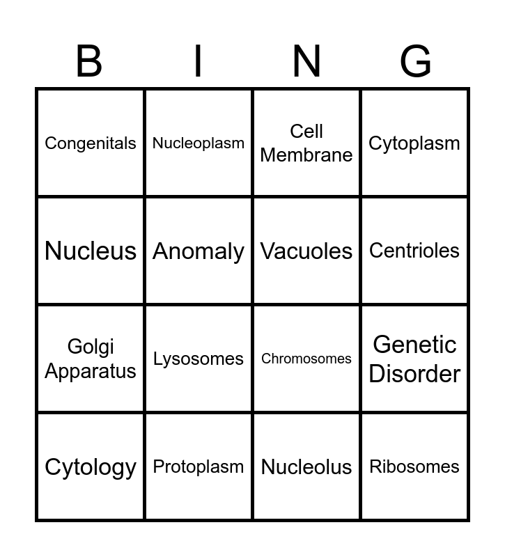 This bingo card has 16 words: Cytology, Protoplasm, Cell Membrane, Cytoplasm, Nucleus, Nucleoplasm, Chromosomes, Genetic Disorder, Congenitals, Anomaly, Nucleolus, Centrioles, Golgi Apparatus, Lysosomes, Vacuoles and Ribosomes.