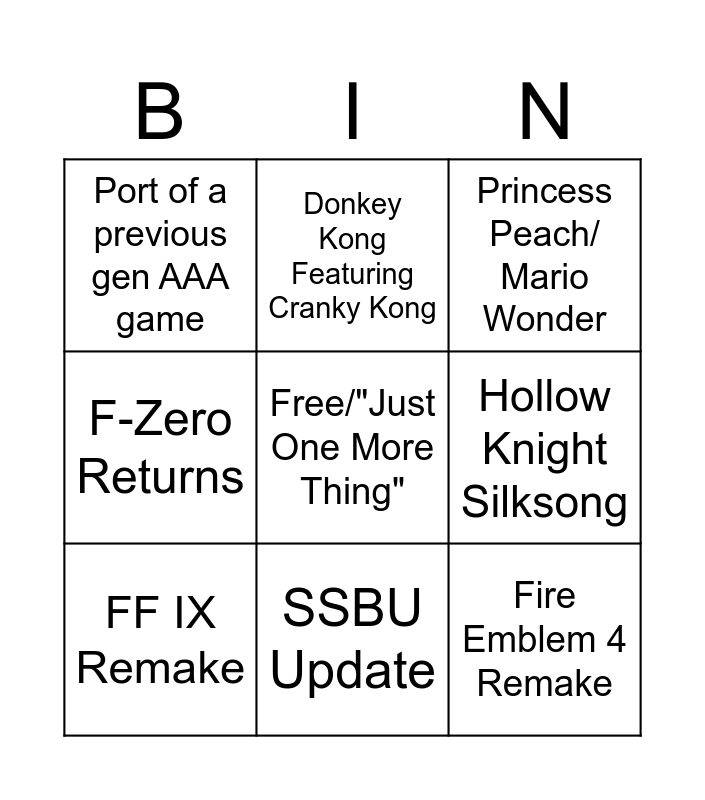 This bingo card has a free space and 8 words: Hollow Knight Silksong, Princess Peach/ Mario Wonder, Donkey Kong Featuring Cranky Kong, FF IX Remake, Port of a previous gen AAA game, Fire Emblem 4 Remake, F-Zero Returns and SSBU Update.