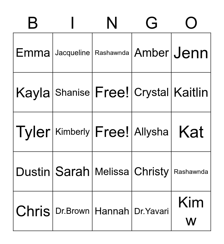 This bingo card has a free space and 24 words: Sarah, Dr.Brown, Free!, Chris, Jenn, Emma, Kayla, Jacqueline, Allysha, Melissa, Crystal, Tyler, Christy, Rashawnda, Shanise, Dr.Yavari, Kat, Rashawnda, Kaitlin, Kimberly, Kim w, Dustin, Amber and Hannah.