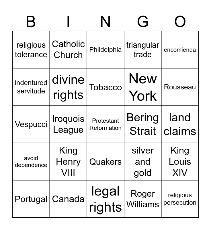 This bingo card has 45 words: tariffs, Protestant Reformation, Middle Passage, Portugal, Pilgrims, Roger Williams, Phildelphia, separation of power, encomienda, Canada, triangular trade, Bering Strait, Quakers, King Henry VIII, smallpox, legal rights, shipbuilding, Vespucci, Corn and potatoes, Rousseau, Catholic Church, censorship, Maryland, religious tolerance, Aztecs, land claims, spread Christianity, fur trade, silver and gold, avoid dependence, Arabs, King Louis XIV, Carolinas, Spain, Harvard, Iroquois League, westward, Bahamas, religious persecution, Tobacco, indentured servitude, New York, John Locke, divine rights and Thanksgiving.