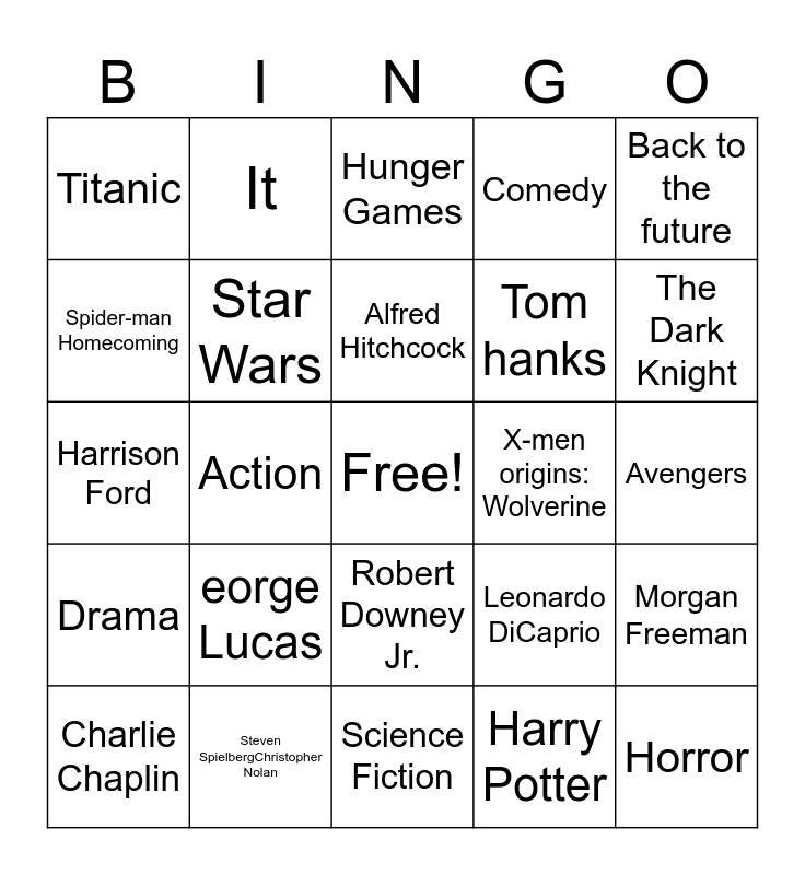 This bingo card has a free space and 24 words: eorge Lucas, Steven SpielbergChristopher Nolan, Alfred Hitchcock, Charlie Chaplin, Back to the future, Titanic, Spider-man Homecoming, It, X-men origins: Wolverine, Robert Downey Jr., Tom hanks, Harrison Ford, Leonardo DiCaprio, Morgan Freeman, Star Wars, Harry Potter, Avengers, Hunger Games, The Dark Knight, Action, Horror, Drama, Comedy and Science Fiction.