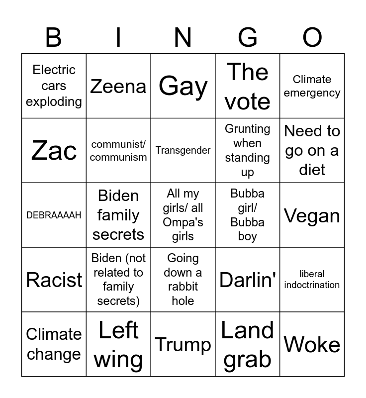 This bingo card has a free space and 25 words: Biden (not related to family secrets), Trump, Transgender, Climate change, Climate emergency, Electric cars exploding, Zac, Zeena, Bubba girl/ Bubba boy, Going down a rabbit hole, Grunting when standing up, DEBRAAAAH, Darlin', liberal indoctrination, communist/ communism, The leftist education system, Vegan, Gay, Need to go on a diet, Biden family secrets, Woke, Left wing, Racist, The vote and Land grab.
