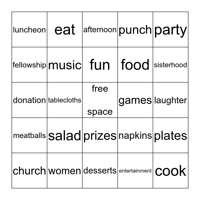 This bingo card has a free space and 24 words: salad, women, fun, church, party, luncheon, fellowship, eat, games, prizes, food, donation, napkins, plates, music, entertainment, laughter, afternoon, sisterhood, tablecloths, cook, meatballs, punch and desserts.