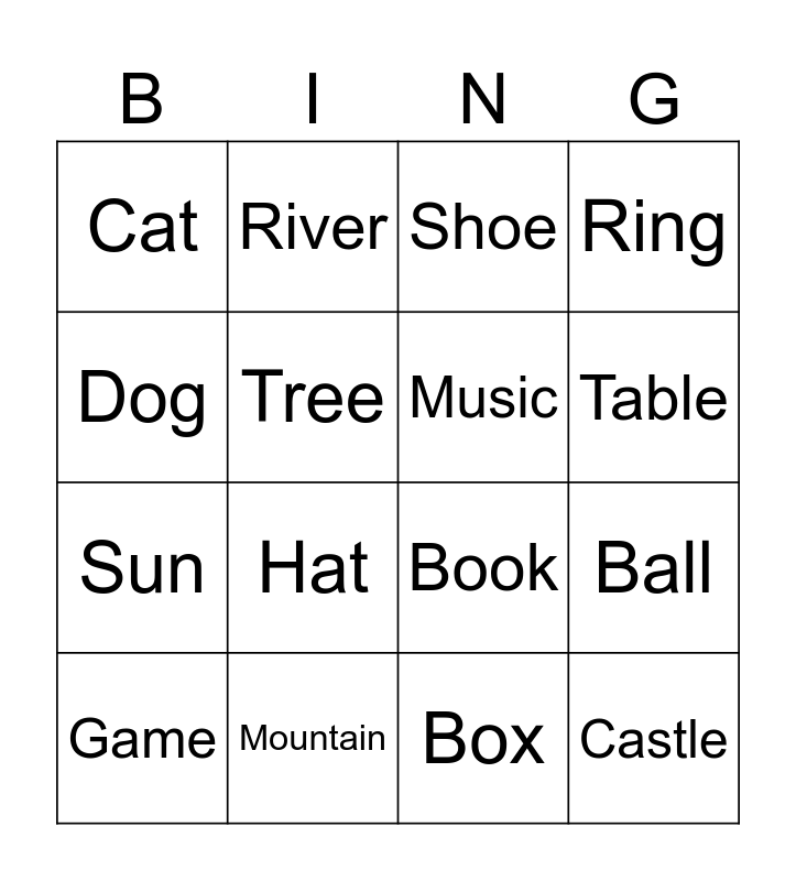 This bingo card has 25 words: Apple, Chair, Table, Car, Dog, Cat, Tree, River, Mountain, Moon, Sun, Book, Film, Dance, Music, Key, Box, Shoe, Hat, Ball, Game, Ship, Castle, Ring and Guitar.