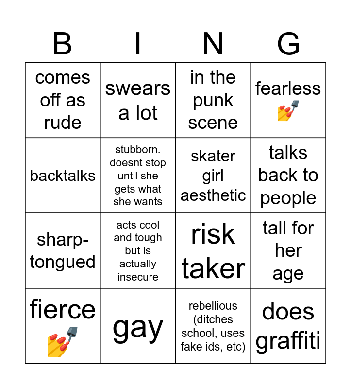 This bingo card has 17 words: fierce💅, gay, in the punk scene, fearless 💅, sharp-tongued, stubborn. doesnt stop until she gets what she wants, risk taker, talks back to people, backtalks, acts cool and tough but is actually insecure, rebellious (ditches school, uses fake ids, etc), tall for her age, comes off as rude, swears a lot, skater girl aesthetic, does graffiti and smokes.