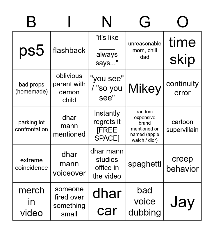 This bingo card has a free space and 25 words: dhar mann voiceover, dhar car, "you see" / "so you see", merch in video, time skip, ps5, bad props (homemade), flashback, random expensive brand mentioned or named (apple watch / dior), dhar mann studios office in the video, Mikey, parking lot confrontation, spaghetti, creep behavior, oblivious parent with demon child, kids with ipad, cartoon supervillain, "it's like ____ always says...", continuity error, dhar mann mentioned, Jay, someone fired over something small, extreme coincidence, unreasonable mom, chill dad and bad voice dubbing.