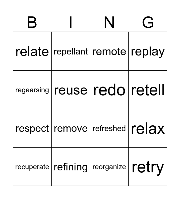 This bingo card has 20 words: relax, rebuild, remote, revive, recuperate, regearsing, refining, relate, respect, repellant, remove, refreshed, reuse, retry, redo, reread, retell, replay, reorganize and restack.