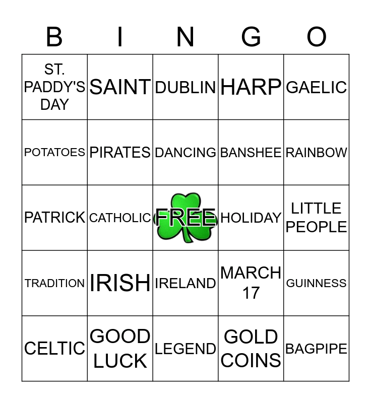 This bingo card has a free space and 44 words: CELEBRATE, BAGPIPE, BLARNEY STONE, CELTIC, CLOVER, GOLD COINS, DUBLIN, EMERALD ISLE, GAELIC, GOOD LUCK, HARP, HOLIDAY, IRELAND, IRISH, JIG, LEGEND, LEPRECHAUN, PATRICK, POT OF GOLD, RAINBOW, SAINT, SHAMROCK, SNAKE, ST. PADDY'S DAY, LIMERICK, LITTLE PEOPLE, LUCKY, MAGICAL, MARCH 17, TRADITION, PINCH, GUINNESS, MISCHIEF, PARADE, CATHOLIC, GREEN, CHURCH, TRINITY, DANCING, POTATOES, BANSHEE, BRITAIN, PIRATES and CORNED BEEF & CABBAGE.