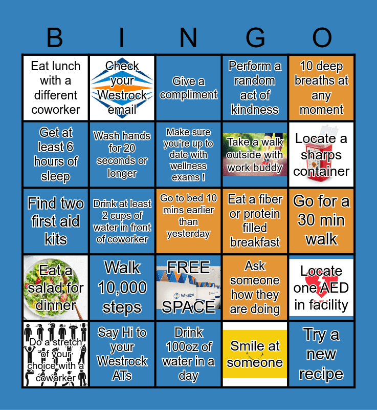 This bingo card has 8 images and 25 words: Walk 10,000 steps, Drink 100oz of water in a day, Make sure you’re up to date with wellness exams !, Do a stretch of your choice with a coworker, 10 deep breaths at any moment, Eat lunch with a different coworker, Get at least 6 hours of sleep, Check your Westrock email, Eat a fiber or protein filled breakfast, FREE SPACE, Take a walk outside with work buddy, Find two first aid kits, Ask someone how they are doing, Locate one AED in facility, Wash hands for 20 seconds or longer, Try a new recipe, Go for a 30 min walk, Give a compliment, Locate a sharps container, Drink at least 2 cups of water in front of coworker, Go to bed 10 mins earlier than yesterday, Say Hi to your Westrock ATs, Eat a salad for dinner, Perform a random act of kindness and Smile at someone.