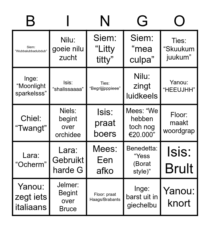This bingo card has 30 words: Jelmer: Begint over Bruce, Jelmer: “Miln”, Niels: begint over orchidee, Niels: “grahhhh”, Siem: “Wubbalubbadubdub”, Siem: “Litty titty”, Isis: “shalissaaaa”, Mees: Een afko, Mees: “We hebben toch nog €20.000”, Floor: praat Haags/Brabants, Floor: maakt woordgrap, Isis: praat boers, Inge: barst uit in giechelbu, Yanou: knort, Yanou: “HEEUJHH”, Benedetta: “fun”, Benedetta: “Yess (Borat style)”, Lara: “Ocherm”, Lara: Gebruikt harde G, Ties: “Skuukum juukum”, Chiel: “Twangt”, Chiel: praat brits, Nilu: goeie nilu zucht, Nilu: zingt luidkeels, Inge: “Moonlight sparkelsss”, Siem: “mea culpa”, Isis: Brult, Yanou: zegt iets italiaans, Ties: “Begrijjjpppieee” and Inge: barst uit in giechelbu.