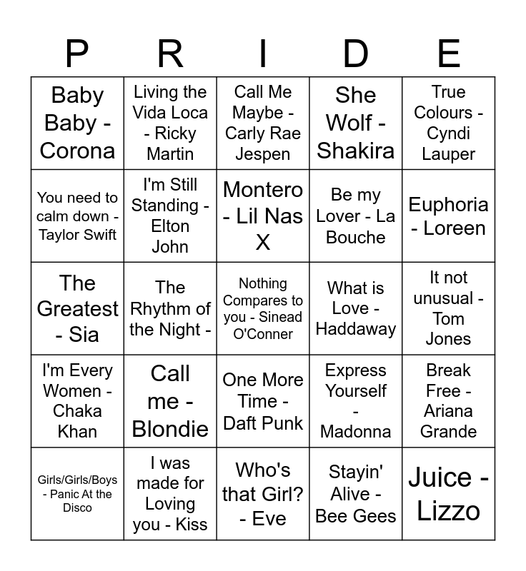 This bingo card has 47 words: I feel love - Donna Summer, Nothing Compares to you - Sinead O'Conner, Really Dont Care - Demi Leovato, Who's that Girl? - Eve, Call me - Blondie, We R Who We R - Ke$ha, Living the Vida Loca - Ricky Martin, Rain on me - Lady Gaga, You need to calm down - Taylor Swift, Take me to Church - Hoizer, I'm Still Standing - Elton John, She Wolf - Shakira, Break Free - Ariana Grande, Express Yourself - Madonna, You Make me Feel - Sylvester, Smalltown Boy - Bronski Beat, Montero - Lil Nas X, What is Love - Haddaway, Beautiful - Christina Aguilera, True Colours - Cyndi Lauper, The Rhythm of the Night -, Stayin' Alive - Bee Gees, Baby Baby - Corona, Be my Lover - La Bouche, Closer - Tegan & Sara, Euphoria - Loreen, Girls/Girls/Boys - Panic At the Disco, Crazy in Love - Beyonce, One More Time - Daft Punk, I'm Every Women - Chaka Khan, Total Eclipse of the Heart - Bonnie Tyler, I'm Ready - Sam Smith, Jolene - Dolly Parton, Blow you Mind - Dua Lipa, Brave - Sara Bareilles, I was made for Loving you - Kiss, It not unusual - Tom Jones, Tell it to my Heart - Taylor Dayne, The Pointer Sisters - Jump!, Strong Enough - Cher, Juice - Lizzo, Call Me Maybe - Carly Rae Jespen, The Greatest - Sia, Waterfalls - TLC, Lights Up - Harry Styles, Te Amo - Rihanna and Too Good at Goodbyes - Sam Smith.
