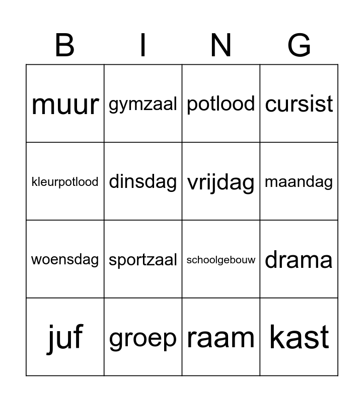 This bingo card has 44 words: schrift, juf, meester, lokaal, kast, pen, potlood, papier, kleurpotlood, leerling, cursist, groep, boek, map, gum, liniaal, schaar, schoolgebouw, schoolplein, sportzaal, gymzaal, stoel, tafel, muur, vloer, raam, plafond, deur, lamp, kast, Nederland, rekenen, sport, kunst, drama, klas, pauze, zondag, maandag, dinsdag, woensdag, donderdag, vrijdag and zaterdag.