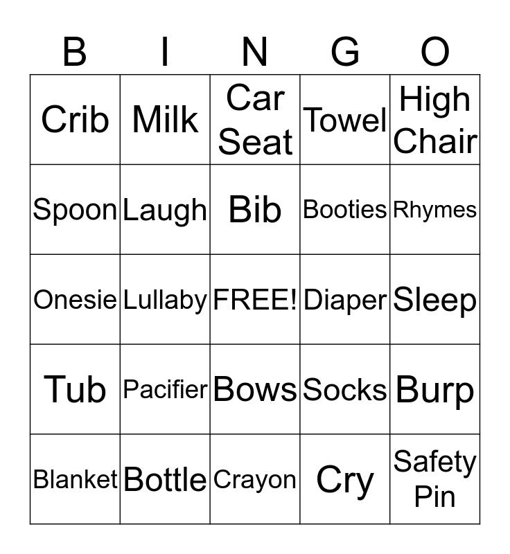 This bingo card has a free space and 24 words: Pacifier, Bottle, Bib, Blanket, High Chair, Crib, Spoon, Milk, Diaper, Bows, Booties, Onesie, Socks, Burp, Laugh, Cry, Sleep, Car Seat, Rhymes, Lullaby, Safety Pin, Tub, Towel and Crayon.