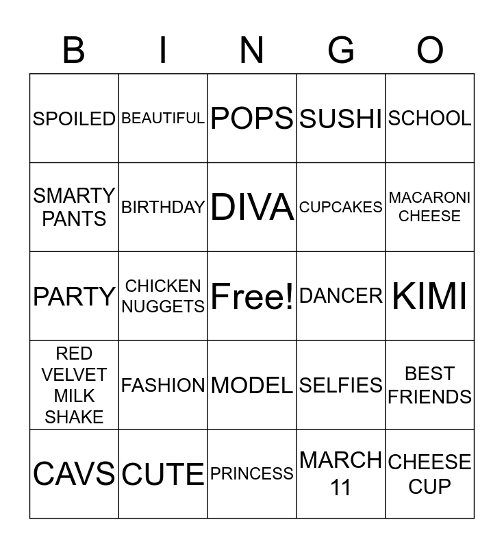 This bingo card has a free space and 24 words: FASHION, CUTE, DIVA, CAVS, SCHOOL, SPOILED, SMARTY PANTS, BEAUTIFUL, DANCER, MODEL, CUPCAKES, PARTY, SELFIES, BEST FRIENDS, BIRTHDAY, MARCH 11, KIMI, POPS, MACARONI CHEESE, CHICKEN NUGGETS, CHEESE CUP, RED VELVET MILK SHAKE, SUSHI and PRINCESS.