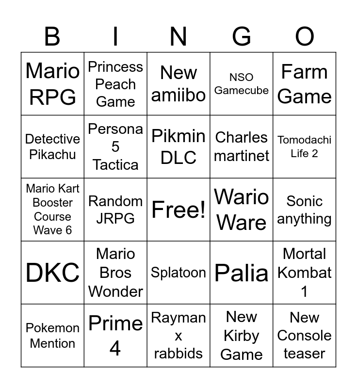 This bingo card has a free space and 24 words: Mario Bros Wonder, Prime 4, Pikmin DLC, Pokemon Mention, Farm Game, Mario RPG, Detective Pikachu, Princess Peach Game, Wario Ware, Splatoon, Charles martinet, Mario Kart Booster Course Wave 6, Palia, Mortal Kombat 1, Persona 5 Tactica, New Kirby Game, Sonic anything, New amiibo, Tomodachi Life 2, Random JRPG, New Console teaser, DKC, NSO Gamecube and Rayman x rabbids.