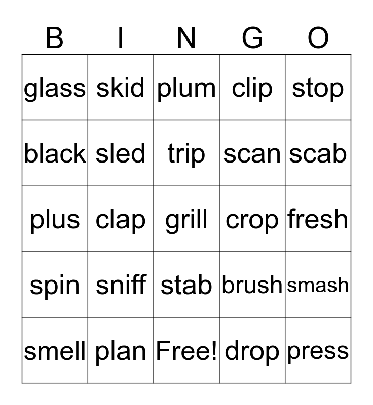 This bingo card has 31 words: Free!, block, clap, flag, glass, plum, sled, brush, crop, drop, fresh, grill, press, truck, scab, skin, smash, sniff, spin, stab, stop, spell, smell, skid, scan, black, clip, plus, plan, trip and drum.