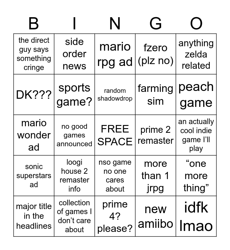 This bingo card has a free space and 24 words: loogi house 2 remaster info, collection of games I don’t care about, random shadowdrop, major title in the headlines, anything zelda related, the direct guy says something cringe, DK???, side order news, prime 2 remaster, nso game no one cares about, farming sim, mario wonder ad, more than 1 jrpg, “one more thing”, sports game?, new amiibo, an actually cool indie game I’ll play, mario rpg ad, peach game, no good games announced, idfk lmao, sonic superstars ad, fzero (plz no) and prime 4? please?.