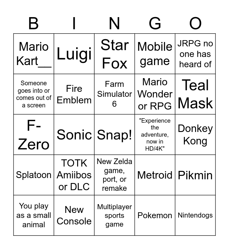 This bingo card has a free space and 24 words: TOTK Amiibos or DLC, New Console, Farm Simulator 6, You play as a small animal, JRPG no one has heard of, Mario Kart__, Someone goes into or comes out of a screen, Luigi, "Experience the adventure, now in HD/4K", New Zelda game, port, or remake, Mario Wonder or RPG, F-Zero, Metroid, Pikmin, Fire Emblem, Pokemon, Donkey Kong, Star Fox, Teal Mask, Sonic, Nintendogs, Splatoon, Mobile game and Multiplayer sports game.