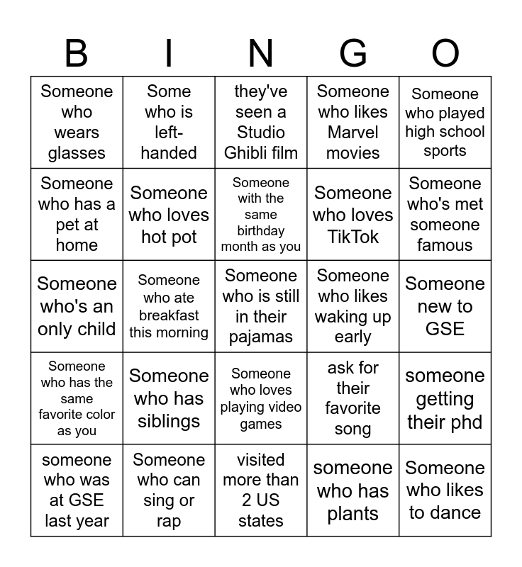 This bingo card has 25 words: Someone who has siblings, visited more than 2 US states, Someone with the same birthday month as you, someone who was at GSE last year, Someone who played high school sports, Someone who wears glasses, Someone who has a pet at home, Some who is left-handed, Someone who likes waking up early, Someone who loves playing video games, Someone who loves TikTok, Someone who's an only child, ask for their favorite song, someone getting their phd, Someone who loves hot pot, Someone who likes to dance, Someone new to GSE, they've seen a Studio Ghibli film, Someone who's met someone famous, Someone who ate breakfast this morning, Someone who is still in their pajamas, Someone who can sing or rap, Someone who has the same favorite color as you, Someone who likes Marvel movies and someone who has plants.