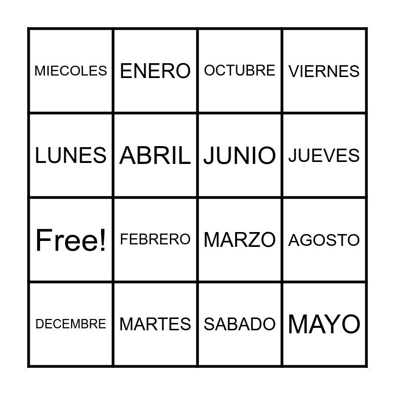 This bingo card has 20 words: AGOSTO, SEPTEMBRE, OCTUBRE, NOVEMBRE, DECEMBRE, LUNES, MARTES, MIECOLES, Free!, ENERO, FEBRERO, MARZO, ABRIL, MAYO, JUNIO, JULIO, JUEVES, VIERNES, SABADO and DOMINGO.