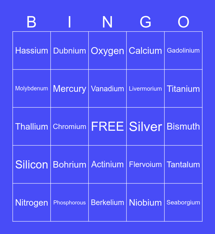 This bingo card has a free space and 117 words: Hydrogen, Lithium, Beryllium, Sodium, Magnesium, Potassium, Calcium, Scandium, Rubidium, Strontium, Yttrium, Caesium, Barium, Lanthanum, Francium, Radium, Actinium, Helium, Boron, Carbon, Nitrogen, Oxygen, Flourine, Neon, Aluminium, Silicon, Phosphorous, Sulfur, Chlorine, Argon, Titanium, Vanadium, Chromium, Manganese, Iron, Cobalt, Nickel, Copper, Zinc, Gallium, Geranium, Arsenic, Selenium, Bromine, Krypton, Zirconium, Niobium, Molybdenum, Ruthenium, Rhodium, Palladium, Silver, Cadmium, Indium, Tin, Antimony, Tellurium, Iodine, Xenon, Hafnium, Tantalum, Tungsten, Rhenium, Osmium, Iridium, Platinum, Gold, Mercury, Thallium, Lead, Bismuth, Polonium, Astatine, Radon, Rutherfordium, Dubnium, Seaborgium, Bohrium, Hassium, Meitnerium, Darmstadtium, Roentgenium, Copernicium, Nihonium, Flervoium, Moscovium, Livermorium, Tennessine, Oganesson, Cerium, Praseodymium, Neodymium, Promethium, Samarium, Europium, Gadolinium, Terbium, Dysprosium, Holmium, Erbium, Thulium, Ytterbium, Lutetium, Thorium, Protactinium, Uranium, Neptunium, Plutonium, Americium, Curium, Berkelium, Californium, Einsteinium, Fermium, Mendelevium, Nobelium and Lawrencium.