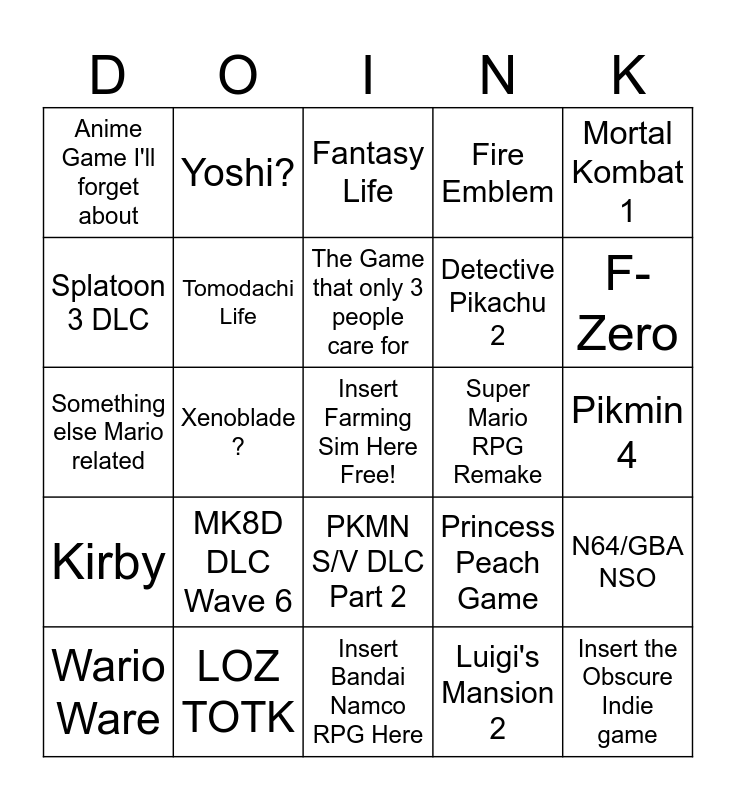 This bingo card has a free space and 24 words: MK8D DLC Wave 6, LOZ TOTK, The Game that only 3 people care for, Wario Ware, Mortal Kombat 1, Anime Game I'll forget about, Splatoon 3 DLC, Yoshi?, Super Mario RPG Remake, PKMN S/V DLC Part 2, Detective Pikachu 2, Something else Mario related, Princess Peach Game, N64/GBA NSO, Tomodachi Life, Luigi's Mansion 2, Pikmin 4, Fantasy Life, F-Zero, Xenoblade ?, Insert the Obscure Indie game, Kirby, Fire Emblem and Insert Bandai Namco RPG Here.