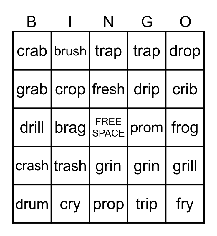 This bingo card has a free space and 24 words: trash, cry, fresh, drum, drop, crab, grab, brush, prom, grin, drip, drill, grin, grill, crop, trip, frog, trap, crib, brag, fry, crash, trap and prop.