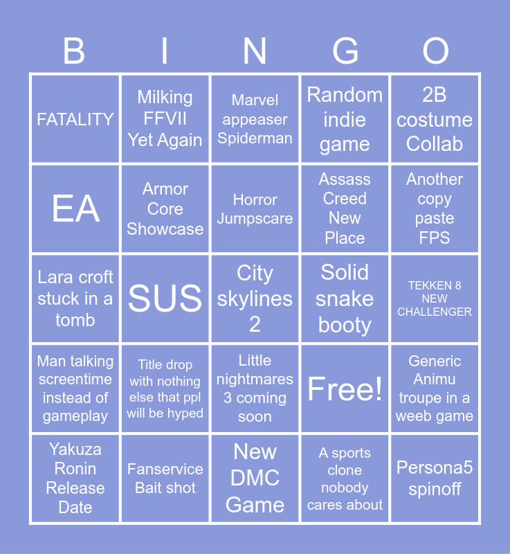 This bingo card has 25 words: Title drop with nothing else that ppl will be hyped, New DMC Game, Horror Jumpscare, Yakuza Ronin Release Date, 2B costume Collab, FATALITY, EA, Milking FFVII Yet Again, Solid snake booty, Little nightmares 3 coming soon, Assass Creed New Place, Lara croft stuck in a tomb, Free!, Generic Animu troupe in a weeb game, Armor Core Showcase, Persona5 spinoff, TEKKEN 8 NEW CHALLENGER, Marvel appeaser Spiderman, Another copy paste FPS, SUS, City skylines 2, Fanservice Bait shot, Man talking screentime instead of gameplay, Random indie game and A sports clone nobody cares about.