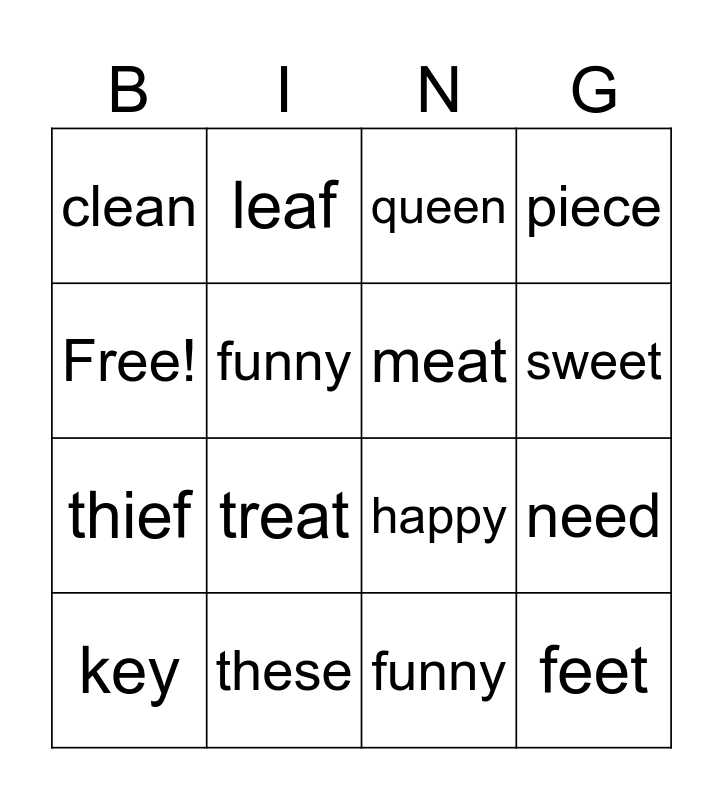 This bingo card has 16 words: these, need, queen, clean, thief, leaf, happy, funny, Free!, funny, key, piece, treat, sweet, meat and feet.