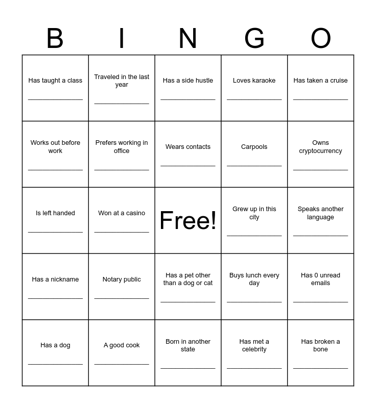This bingo card has a free space and 24 words: Notary public _______________, A good cook _______________, Wears contacts _______________, Has a dog _______________, Has taken a cruise _______________, Has taught a class _______________, Works out before work _______________, Traveled in the last year _______________, Grew up in this city _______________, Has a pet other than a dog or cat _______________, Carpools _______________, Is left handed _______________, Buys lunch every day _______________, Has 0 unread emails _______________, Prefers working in office _______________, Has met a celebrity _______________, Speaks another language _______________, Has a side hustle _______________, Owns cryptocurrency _______________, Won at a casino _______________, Has broken a bone _______________, Has a nickname _______________, Loves karaoke _______________ and Born in another state _______________.