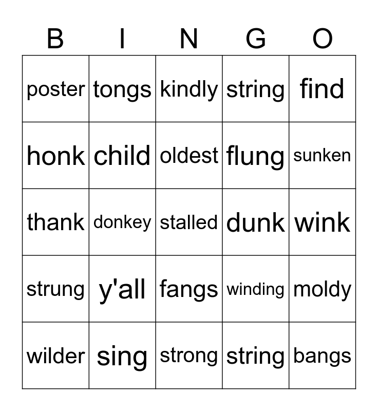 This bingo card has a free space and 24 words: y'all, sing, oldest, wilder, find, poster, honk, tongs, dunk, fangs, flung, thank, winding, moldy, child, string, wink, kindly, sunken, donkey, bangs, strung, string and strong.